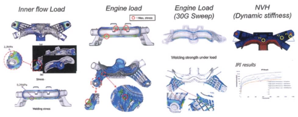 Special three-gate positioning tooling was designed to minimize stress in weld-line area for strength and durability and for processing optimization. A new 35% glass fiber reinforced, heat stabilized polyamide-66 resin was developed for good retention of properties over time at temperatures up to 220°C (428°F).