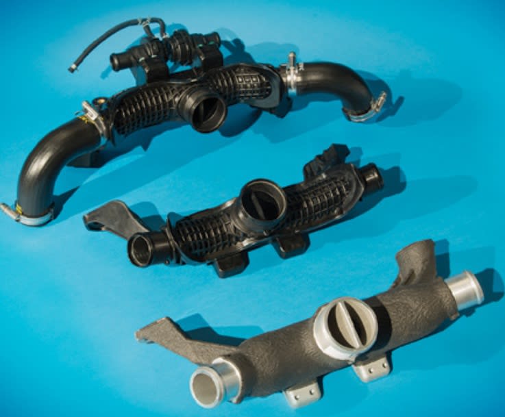 A claimed 42% weight and 35% cost reduction, and improved airflow reducing the pressure drop (-8 kPa) to increase fuel economy and improve NVH performance, were achieved by designing and molding this part with plastic compared to the previous aluminum die casting. Airflow noise was also reduced and long-term durability increased via the rib pattern design.