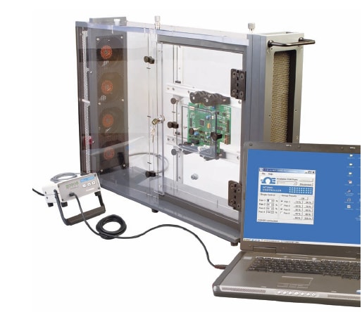 OMEGA Engineering (Stamford, CT) offers the WT-2000 thermal wind tunnel in a portable, benchtop design. Made of clear polycarbonate and PVC, it is designed to provide uniform and repeatable airflow up to 1000 fpm. The control box allows for open-loop, full-scale operation of individual fans, groups of two fans, or all fans at once. The large test chamber with a hinged access door and access panel allows for comparison testing or different size heat sinks and circuit boards. The unit is CE compliant.