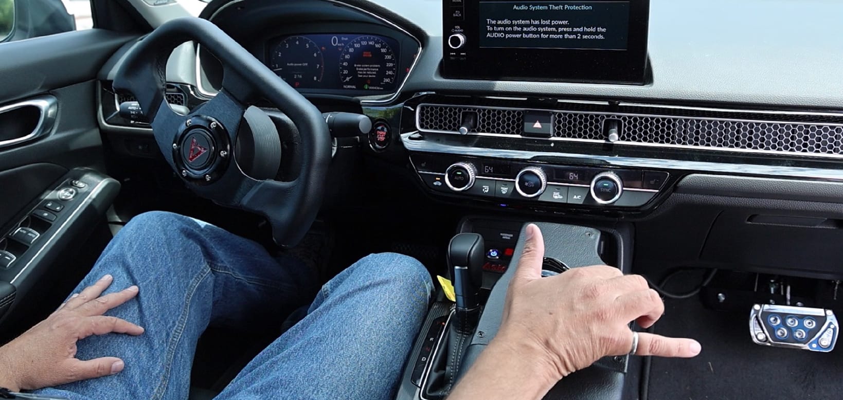 SAE Media test drove Hitachi Astemo’s steer-by-wire system on a Honda Civic with a steering wheel and another Civic sedan equipped with the finger-operated device. Both technology demonstration cars were easy-to-steer through a parking lot dotted with orange cones to replicate slalom curves, a tight U-turn, and a three-point Y-turn.