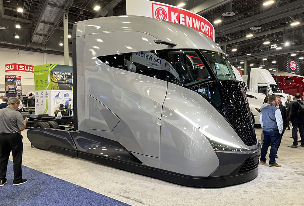 The Kenworth booth at the 2024 Advanced Clean Transportation (ACT) Expo in Las Vegas garnered much interest thanks to the reveal of its futuristic-looking SuperTruck 2. Developed over a six-year period as part of the DOE’s SuperTruck program, the demonstrator vehicle improved freight efficiency by up to 136% compared to the 2009 T660 model. The team improved fuel efficiency up to 12.8 mpg and reduced the combination weight by about 7,100 lb (3,220 kg) — 4,150 lb (1,880 kg) from the tractor and 2,950 lb (1,340 kg) from the trailer. The design led to a 48% reduction in drag compared to Kenworth’s baseline vehicle.