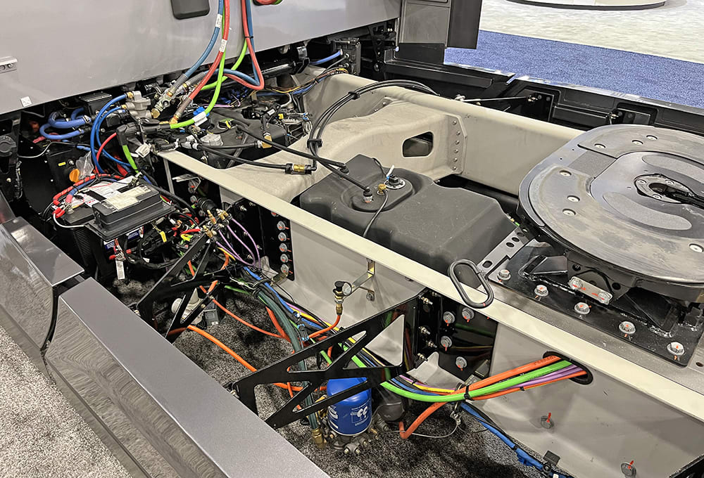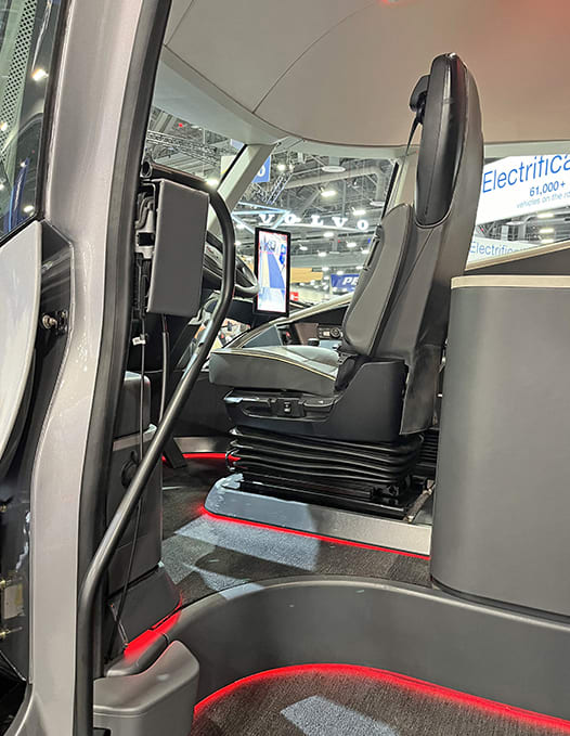 Chassis, front end and cab were the three areas that we got the most weight out. A fully composite cab, so we’re not using a metal structure there. That’s a significant part of the weight reduction. And then redesigning that front end, we were able to take hundreds of pounds out of the design by narrowing the overall axle so that we get enough wheel cut [with the enclosed front tires]. We spent a lot of time with that. The way that we’ve designed our actual frame structure also is a little bit unique with the geometry that we have [reverse splayed frame rails], and that was a big part of the lightweighting. This new, creative front end [allows] the engine to sit lower and behind the front axle, and that also gives us a center drive position.