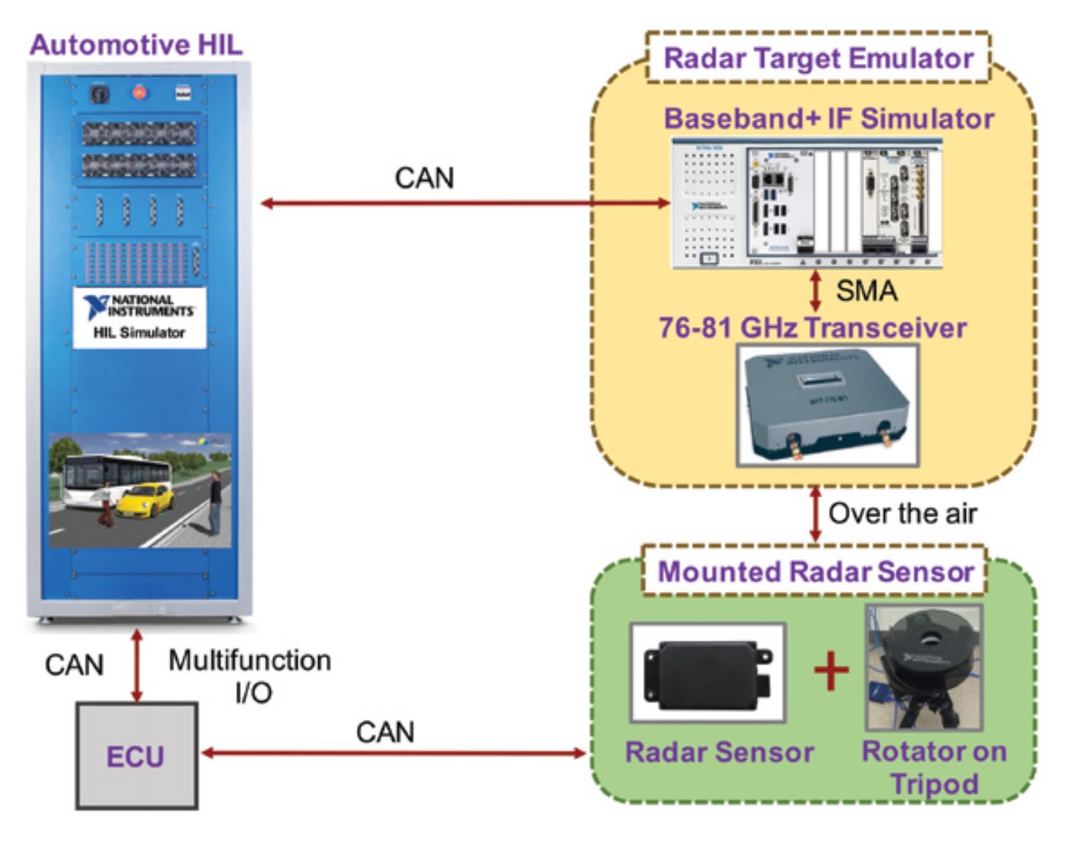 The components in the closed-loop ADAS test platform perform the following actions and interactions within one simulation step. The automotive HIL is responsible for sending a CAN message to command the RTE for target simulation. After receiving the CAN message from the automotive HIL and a transmitted signal from the radar sensor, the vector signal transceiver in the RTE generates and sends a radar target pulse to the mmWave transceiver through SMA connections.