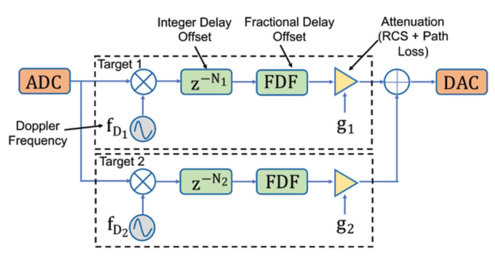 The vector signal transceiver in the RTE simulates a target by modifying the signal received from the Delphi radar based on the target parameters (e.g., location) sent by the automotive HIL, as shown in Fig. 2. In this algorithm, the target velocity is simulated by mixing the Doppler-shift frequency with the transmitted signal, and the target range is simulated by adding integer delays and fractional delay filters (FDF) to the signal. The signal is then amplified/attenuated to reflect the RCS and path loss associated with the target.