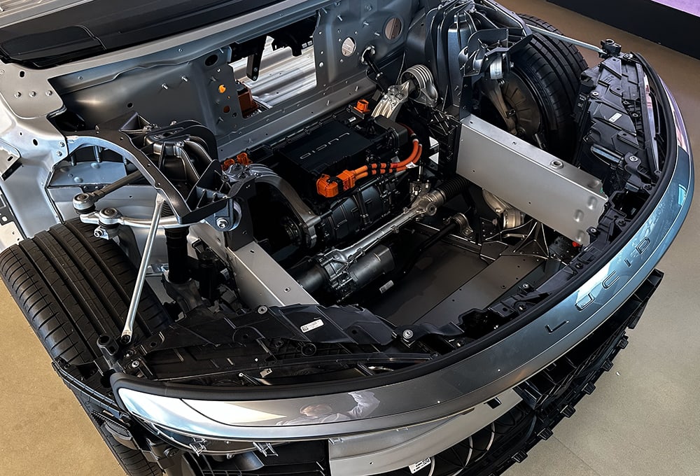 Lucid is also improving its line-up of Air trim levels, even as the various trims keep their differences hidden behind matching sheet metal. The Pure and Sapphire updates, for example, were developed at the same time and Lucid engineers had to develop their own traction control system for these EVs, because the supplier version didn’t perform well enough. The motors in the Grand Touring trim are like version 1.5 – maybe not quite different enough to be considered v2.0, Lucid representatives said – as the engineers continue to improve their understanding of how magnetic fields effect operation and the amount of resistance different coatings have on copper wires. Or take the 38-mm (1.3-in) aluminum busbars in the Air’s battery.