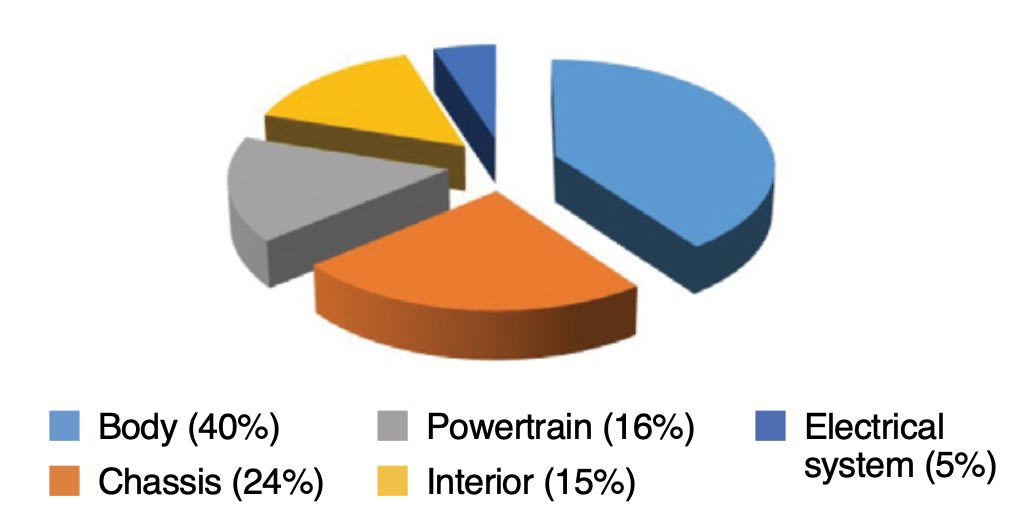 A vehicle can be divided into five different subsystems based on functionality; body, chassis, powertrain, interior and electrical system. Figure 1 shows that the body is the largest mass contributor to the finalized vehicle, with 40% of the total mass attributed to this subsystem. This makes the body a most interesting target for mass reduction. Also, since the body is more or less standardized throughout a model range, mass reduction in the body will contribute to a mass reduction to all trim levels of that model, whereas a mass reduction in interior or powertrain components might apply only to a select number of vehicles.