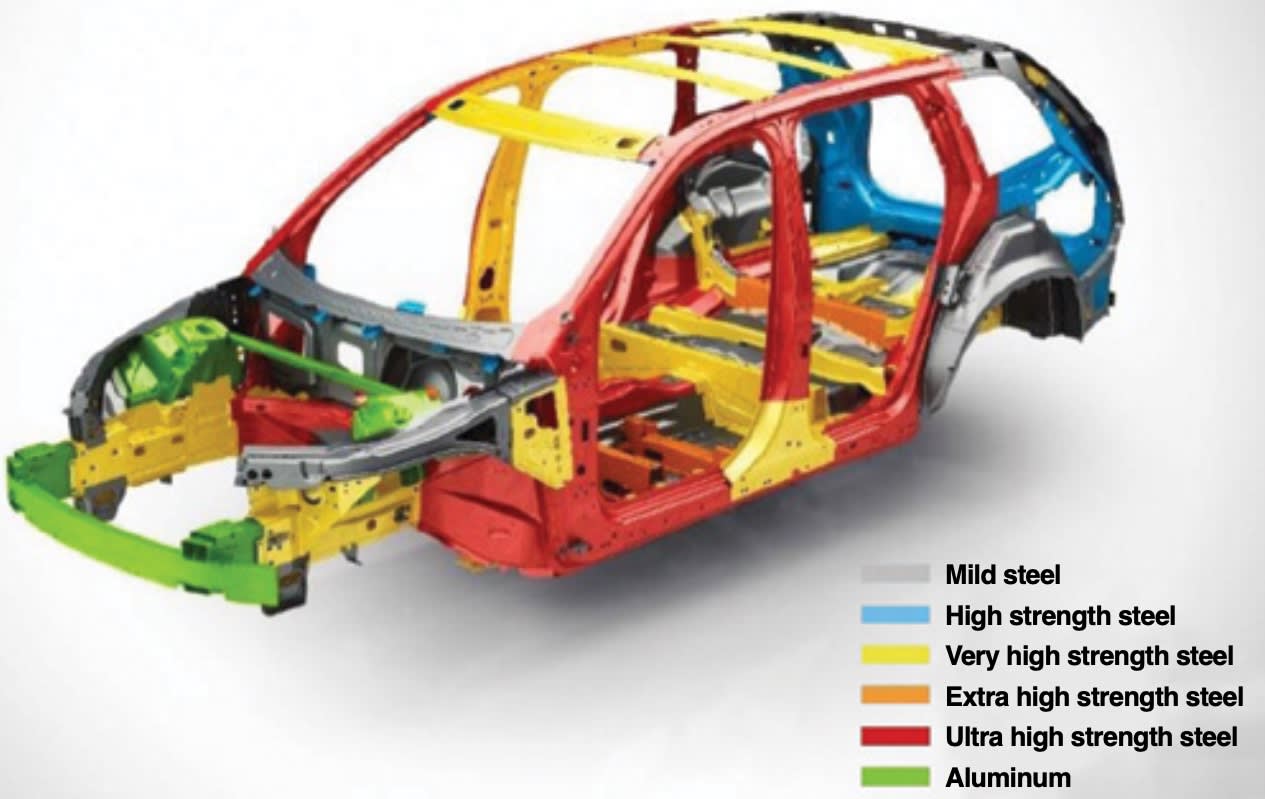 Volvo XC90: Volvo’s XC90 utilizes several different high-strength steel grades as well as aluminum parts for a lightweight but strong body. Within the body structure, joints between these different steels and aluminum are present throughout, as can be seen in Figure 6. Aluminum also is used in the strut towers and the front crash bar, along with the hood and front quarters.