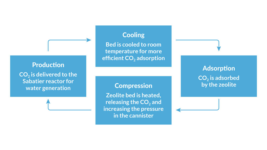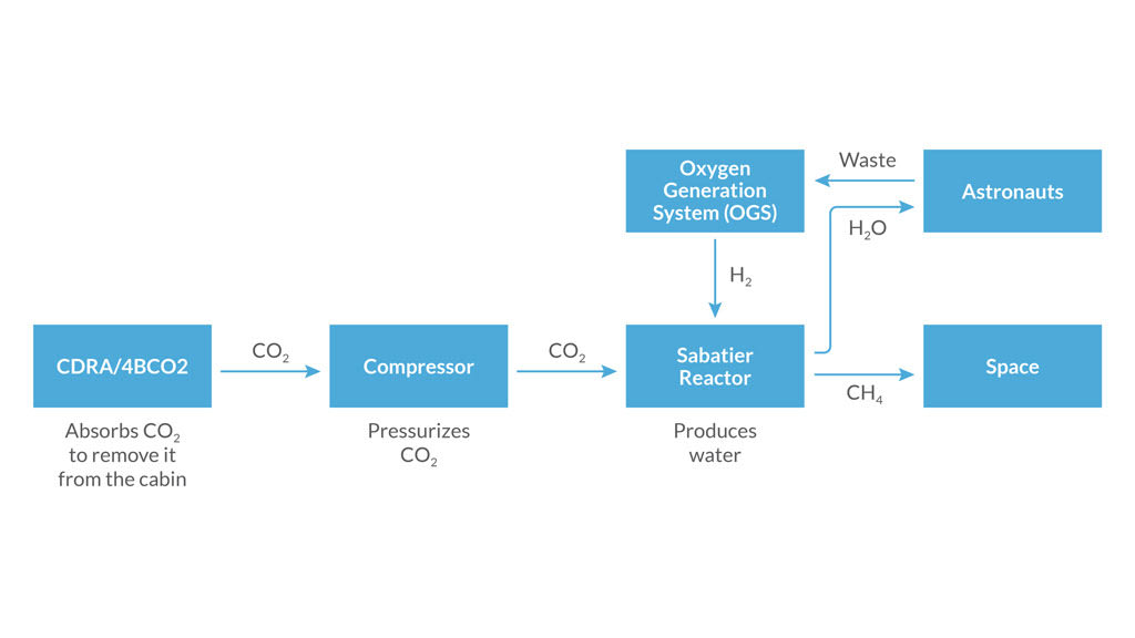 "The CDRA absorbs carbon dioxide to remove it from the cabin. Then that carbon dioxide is sent to a Sabatier reactor [where] it is combined with hydrogen from the oxygen generation system to produce water," she continued. That water is supplied to the astronauts for drinking. The system also yields methane, which is sent into space. (See Figure 2) "We have this closed-loop system to keep the astronauts alive, but in order for the carbon dioxide to work with the Sabatier reactor, it has to be at a higher pressure than what it is absorbed at, so we have a compressor in between the CDRA and the Sabatier reactor," said Dr. Alpert. The CDRA is currently being upgraded to a new four-bed molecular steam system: the four-bed, CO2 scrubber, or 4BCO2 in shorthand.