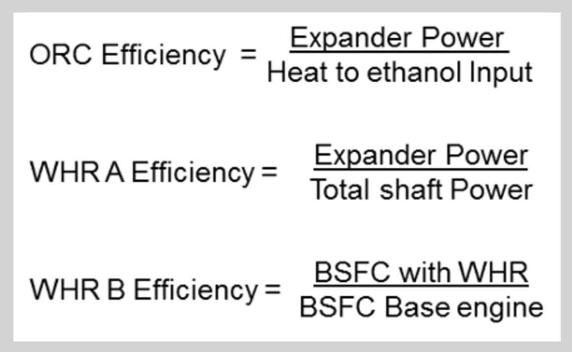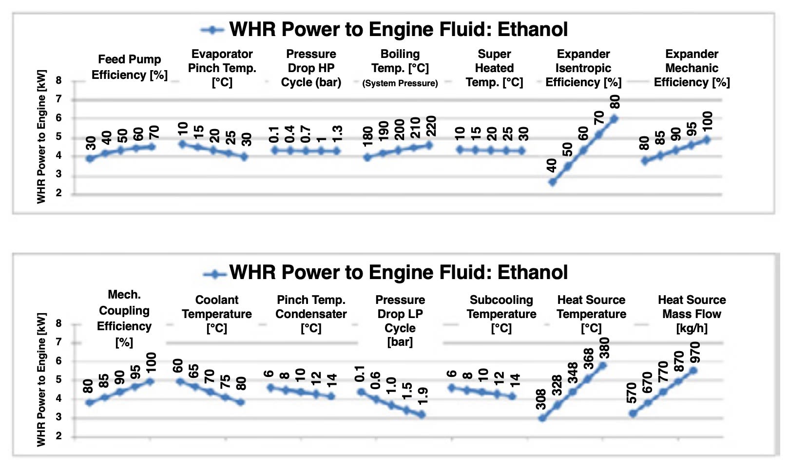 Based on the temperature levels available in the long-haul truck application, ethanol is considered as the best choice due to the highest power output enabling the highest overall efficiency of the complete combustion engine and WHR system.
