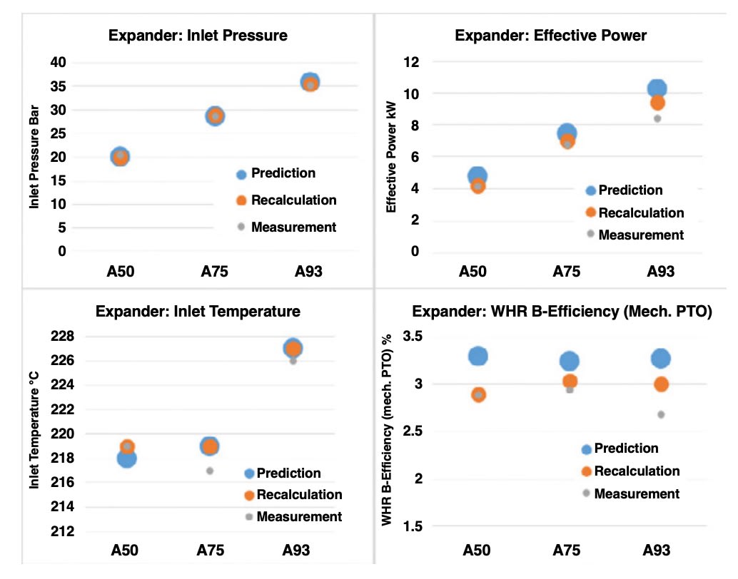 Good correlations between measurement and simulations were shown for temperature and pressure. For expander power and WHR B-Efficiency, the recalculation and measurement were slightly lower especially at operating point A93. The main reason for the differences are the slightly lower expander efficiency for the measurements compared to the supplier maps at this specific load point.