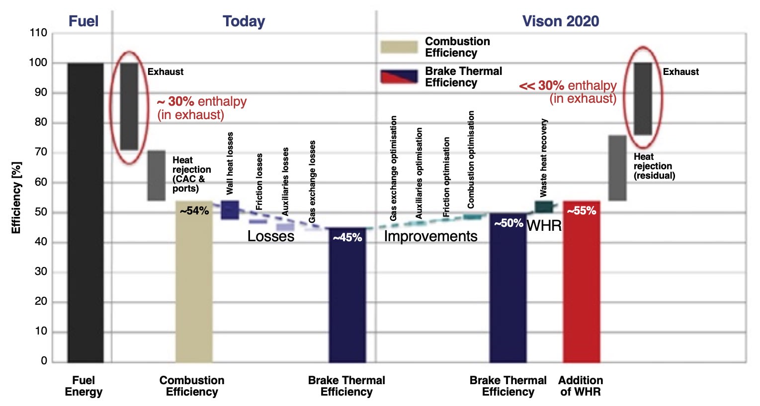 Alongside various technologies, waste heat recovered from exhaust by means of an Organic Rankine Cycle (ORC) will play a significant role to reach this ambitious target. Simulations suggest that by tapping multiple heat sources, up to 5% improvement in engine efficiency is possible. A simplified system harvesting heat from only EGR and exhaust gas will allow up to a 2.5% increase of BTE.