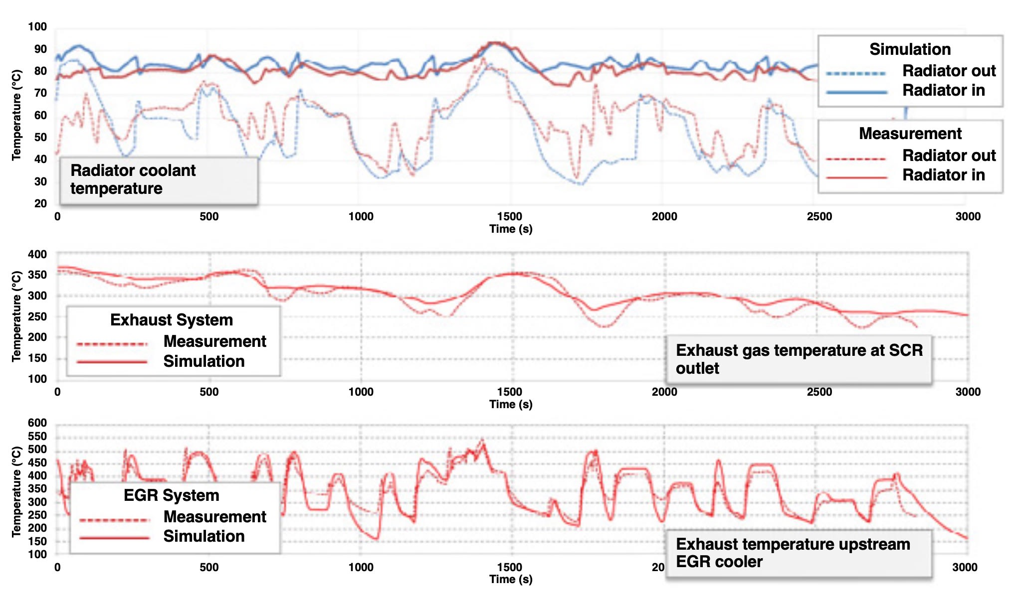 The vehicle model was validated with wind tunnel measurements performed at Mahle test facilities. Good agreement of both cooling system and exhaust system was achieved, with deviations mainly caused by small differences in the control strategy of cooling auxiliaries and necessary simplifications introduced in engine thermodynamic and exhaust aftertreatment modeling.
