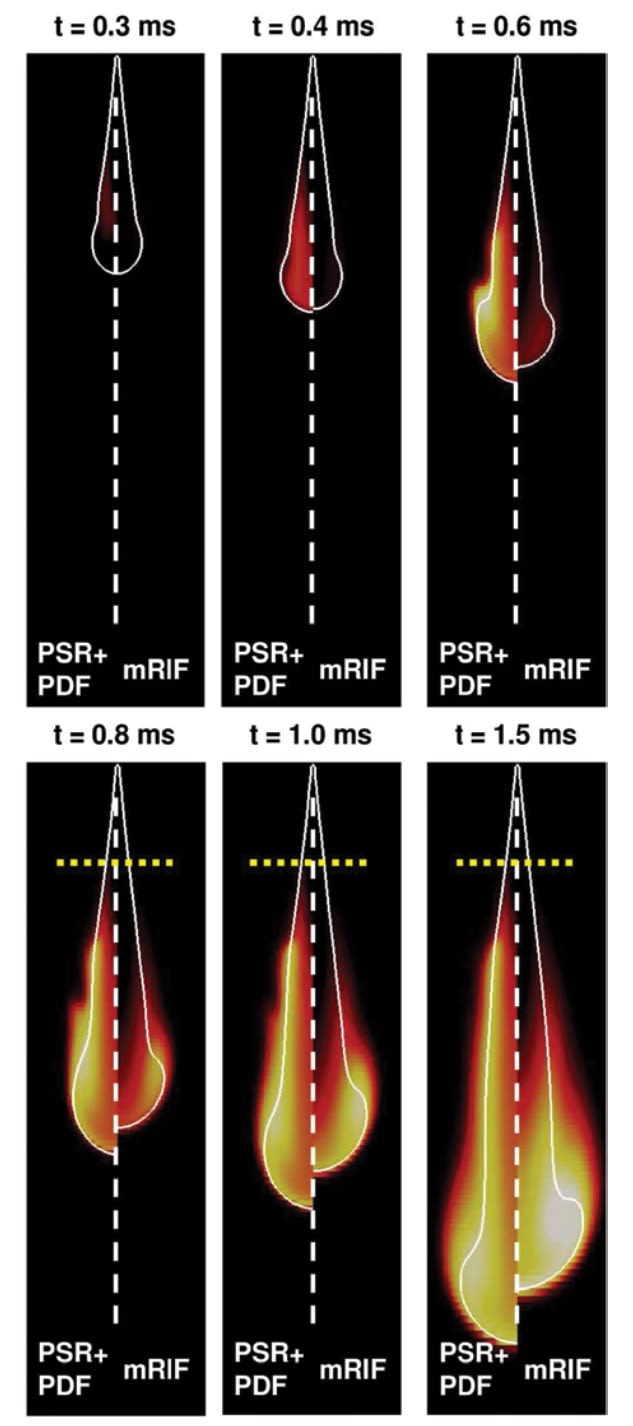 For this reason, the MRIF model does not extinguish the flame and also mixture fraction variance does not play a significant role in the progress variable reaction rate. Simulations with a spray-oriented mesh will be carried out in a future work. Computed flame shapes by both models are not very different during the initial ramp and this is in agreement with their similarities in terms of heat release rate.