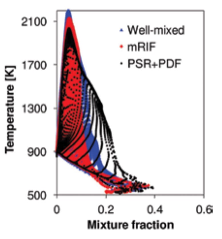 Finally, in terms of computational time, use of tabulated chemistry and already integrated PDF makes the PSR+PDF much faster than the MRIF model by a factor of 30.