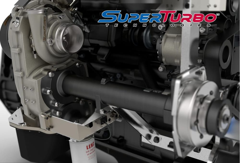 SuperTurbo provided one of its combination supercharger/turbocharger units for the demonstration truck. “What the SuperTurbo unit does is decouple the turbine from the compressor, which enables us to control the compressor relative to the turbine,” Williams explained. “We can actually pull power off of the crank via the pulley on the front of the engine. So that power can be delivered straight to the compressor to supercharge the engine.”