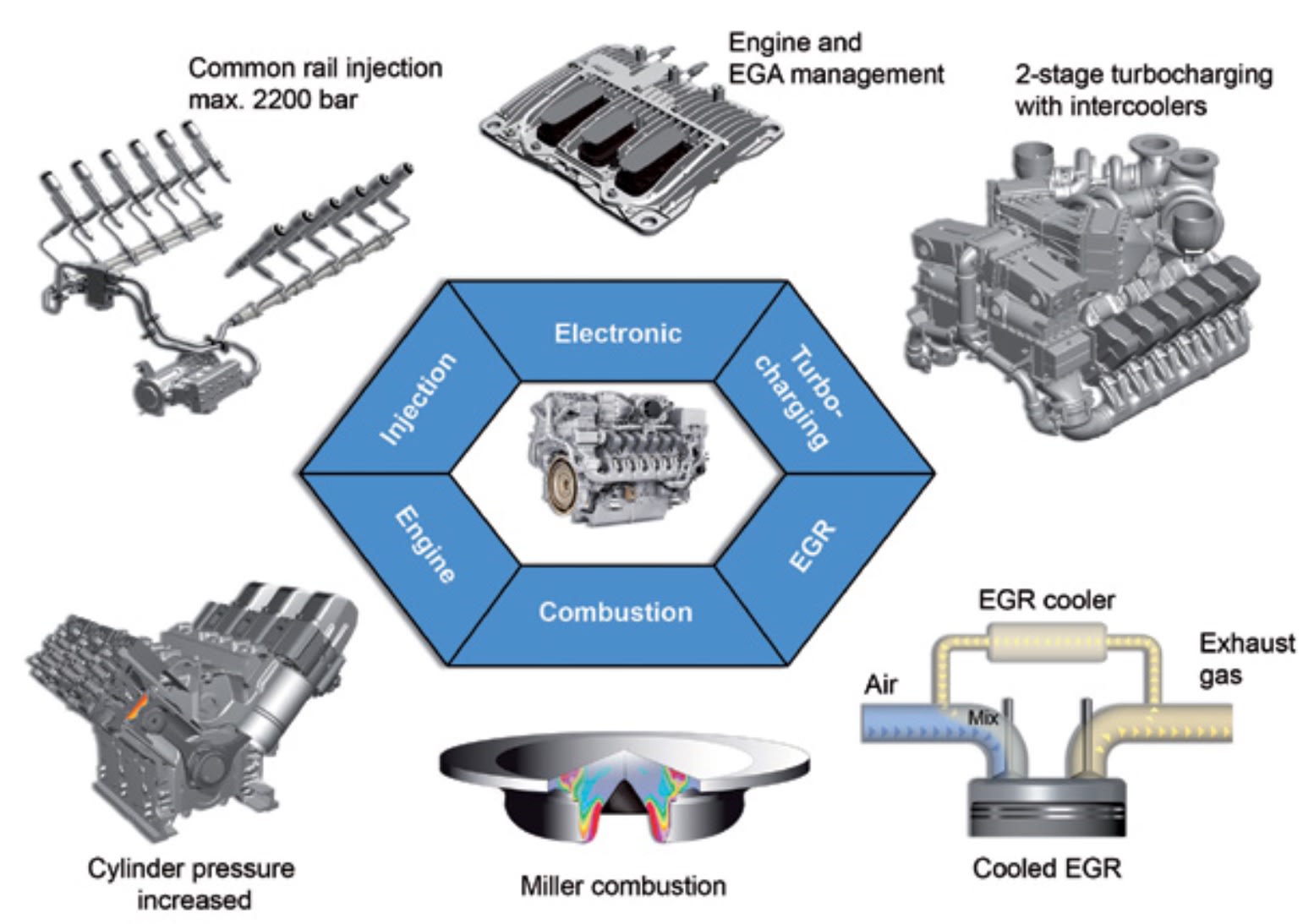 These include: two-stage intercooled, regulated turbo-charging; cooled exhaust gas recirculation (EGR); low emissions combustion with Miller cycle; an advanced injection system; and increased peak cylinder pressures up to 215 bar (3120 psi) — all controlled by a new MTU-produced ADEC engine controller. Because of the size and uniqueness of their engines, they are in fact producers of specific engine components like turbochargers and fuel injection equipment that in other industries are purchased from suppliers.