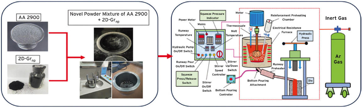 The study presents a novel approach by integrating graphene with Aluminum alloy (AA) 2900 powder, synthesized through a high energy ball milling technique. The resulting powder was used to reinforce Aluminum alloy 2195, creating metal matrix composites (MMCs) via squeeze casting. The findings demonstrate that incorporating 0.5 wt percent 2D graphene nanoplatelets (2D-Grnp) in AA 2195 achieved density match, enabling homogeneous dispersion, addressing composite casting challenges. Consequently, the AA 2900 alloy embedded with 2D-Grnp facilitated the homogeneous dispersion of reinforcements during the squeeze casting process, yielding MMCs Ideal for potential use in lightweight liquid hydrogen fuel tank structures for launch vehicles. Following T8 heat treatment, the final casted composite plate exhibited significant enhancements in ultimate tensile strength, with a 4.5 percent increase over monolithic Al 2195-T8, exhibiting nominal reduction in elongation behavior and higher hardness. Additionally, scanning and transmission electron microscopy (SEM, TEM), Small Angle Neutron Scattering (SANS) and Electron Backscatter Diffraction (EBSD) revealed the squeeze casting technique’s effectiveness by exhibiting enhanced bonding among homogeneously reinforced 2D-Grnp, T1/θ’ precipitates, and AA 2195.