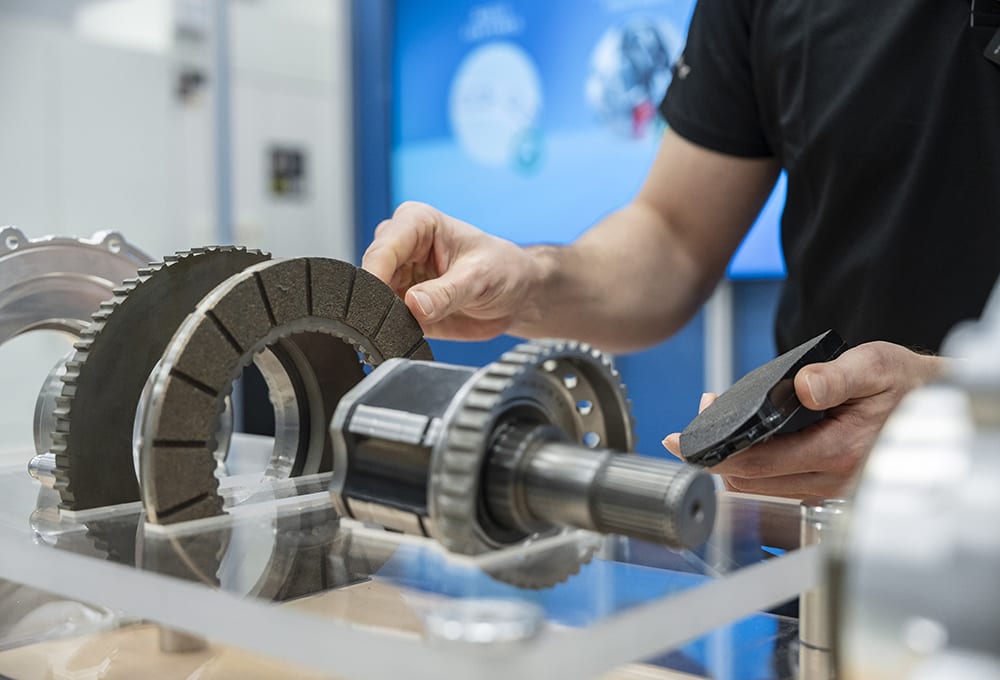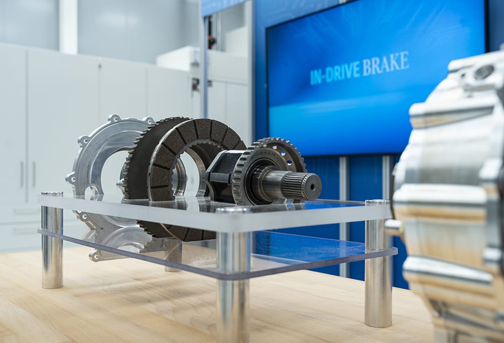 Mercedes’ solution is called “in-drive brakes,” which it showed off recently at its R&D center in Sindelfingen, Germany. These innovative stoppers are integrated directly in electric drive units, sharing space with a motor, transmission and differential. The system switches up the usual role of brake pads and a spinning rotor. A pair of stationary brake discs, to the left and right of the motor/transmission unit, squeeze against a spinning, two-sided circular brake pad that’s connected to the driveshaft.