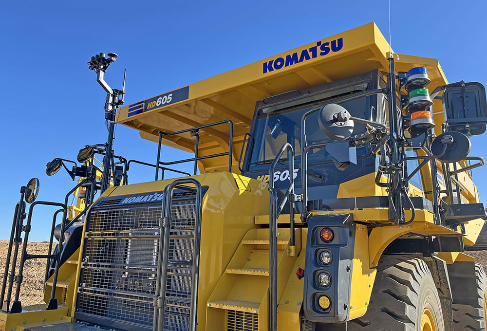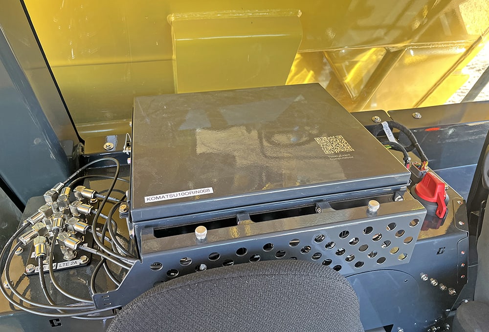 The HD605-10 with Pronto AHS looks similar to the standard model, a notable modification being the mast added to the front for the LTE and GPS to allow the truck to communicate across the network as it’s navigating the quarry. Vehicles are connected through network stations – supplied by Pronto’s subsidiary Pollen Mobile – that Pronto installs on-site. The system communicates outside of the sites typically through Starlink satellite connectivity or the wireless network available onsite.