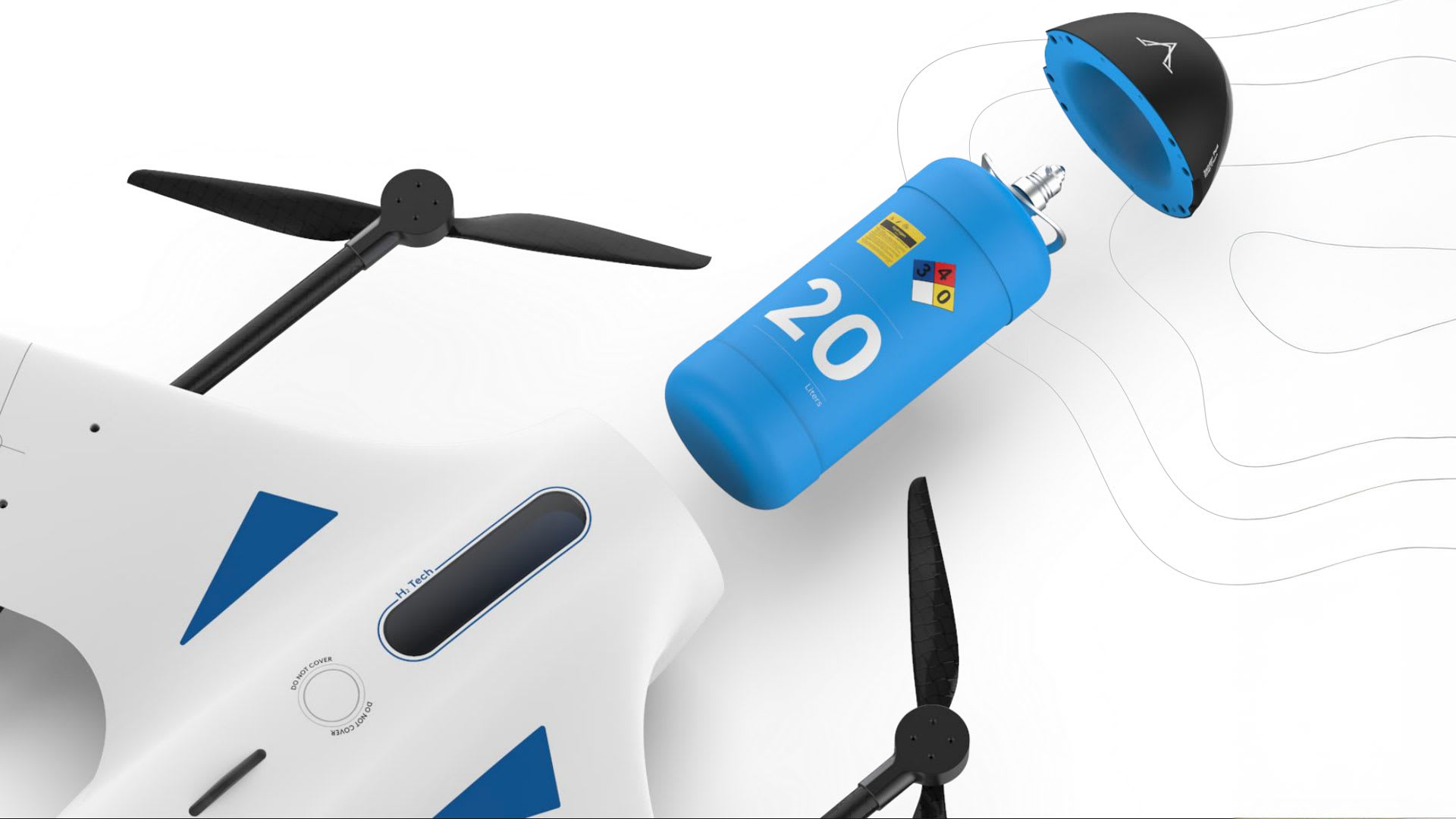 All of Heven's drones are powered by their internally developed hydrogen fuel cells and feature hydrogen tanks.