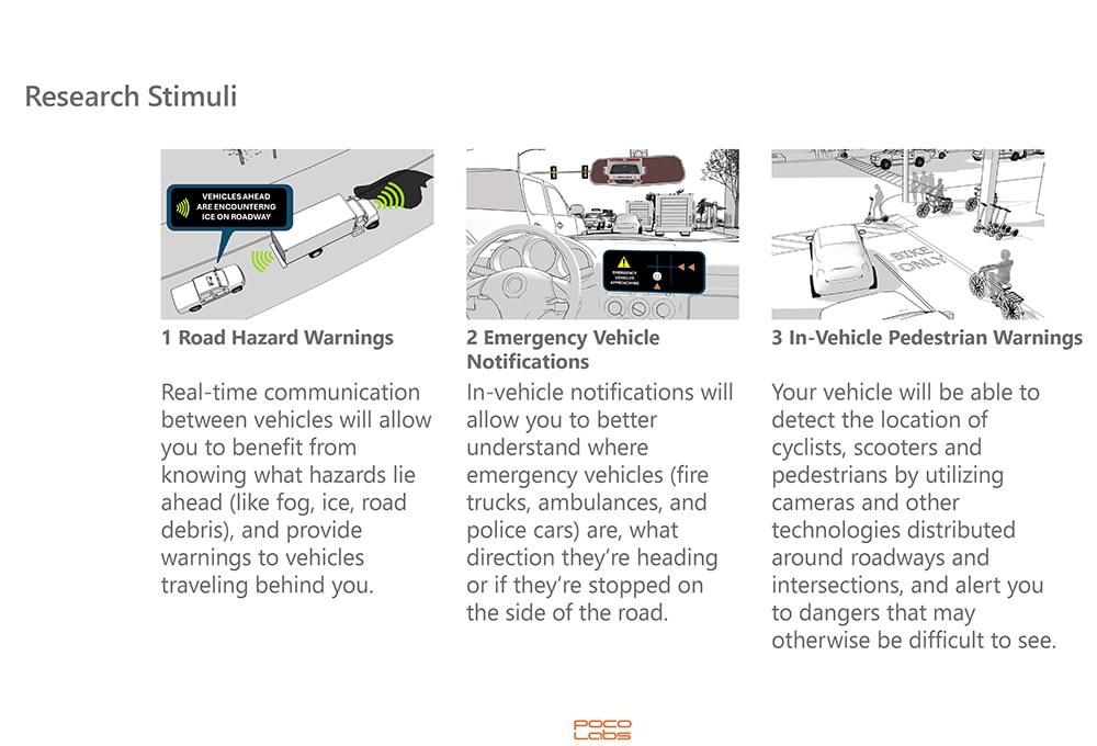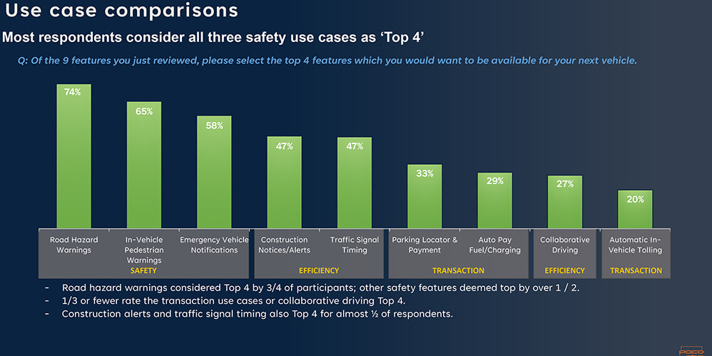 Safety was the most wanted, frequently cited and most valuable item to consumers. More than half of the survey respondents said safety was their No. 1 priority. For example, road hazard identification topped the list, followed by pedestrian warnings and emergency vehicle notifications. These priorities applied roughly equally across all demographic groups.