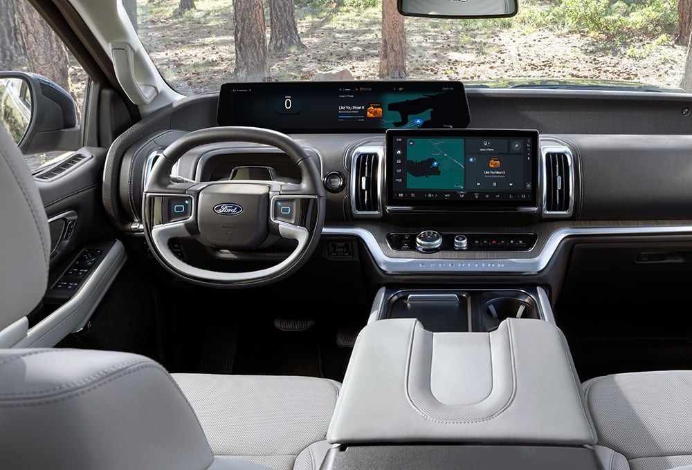 The first two things most drivers will notice when sliding into the Expedition: The 24-inch panoramic display panel that is slightly raised to put more info within the driver’s line of sight, and a curiously shaped steering wheel that some describe as oblong, but seems more like a rectangle with rounded corners. Engineers said that shape is meant to improve dash vision above it and easier ingress and egress for legs below.