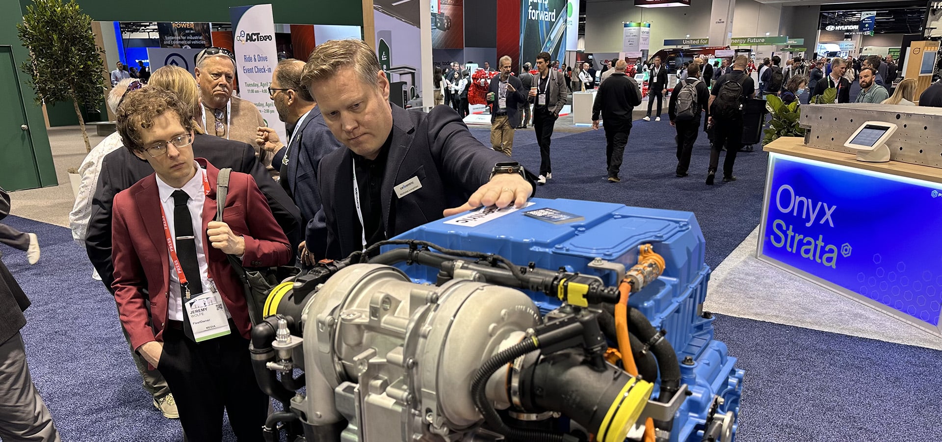 The unit the company has on the road in Europe today, the BZA150, is used in pairs in the same space as a diesel engine. Together the units generate 390 hp (285 kW) and weigh about 1,100 lb (499 kg). That’s about half the weight of most comparable integrated diesel powertrains. Loughlan said that in 2023, a Mercedes-Benz GenH2 truck powered by dual BZA150 cell stacks set a record range of 650 miles (1,047 km) on public roads with one fill-up of 80 kg of liquid H2. The system has also been tested above the Arctic Circle and in Europe’s toughest high-altitude mountain passes where conditions can challenge a diesel’s ability to restart when off. Loughlan said the next-generation Cellcentric stack offers high power, low weight, long range, high flexibility and zero emissions. It will be ready soon for use in North America, Europe and globally. At the ACT Expo, Loughlan talked about the NextGen in front of a full-size model that showed off the dimensions and some design features. Among the features: