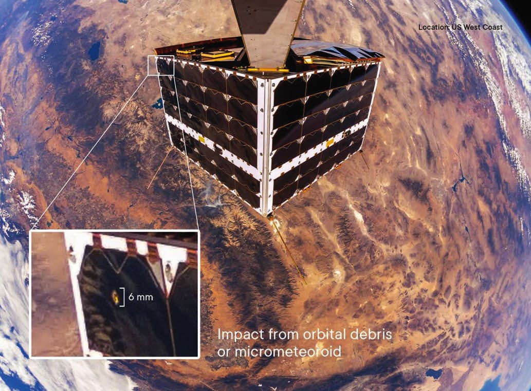 Our MP42 satellite, which launched into low Earth orbit (LEO) two and a half years ago aboard the SpaceX Transporter-4 mission, recently took an unexpected hit from a small piece of space debris or micrometeoroid. The impact created a 6 mm hole, roughly the size of a chickpea, in one of its solar panels.