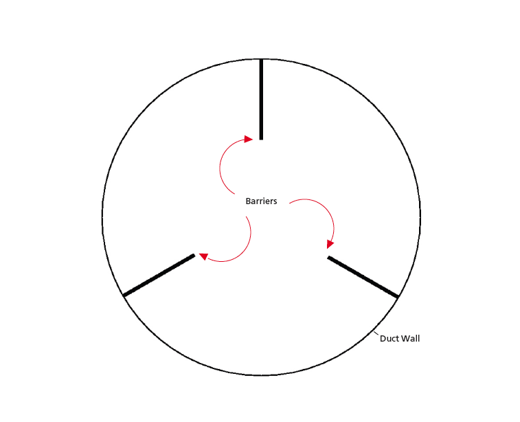 As a potential superior alternative to suppression or interruption, it has been proposed to design and construct cells to disrupt the duct modes that participate in super resonance. In particular, in the case of a hot circular-cross-section jet, the most amplified instability waves are those characterized by azimuthal wave number ±1. These are helical or flapping-mode jet waves that interact with acoustic waves in the corresponding helical and flapping duct normal modes. In principle, it should be possible to prevent super resonance by blocking the helical and flapping duct modes. This could be done by, for example, inserting barriers into the duct as shown in Figure 2.