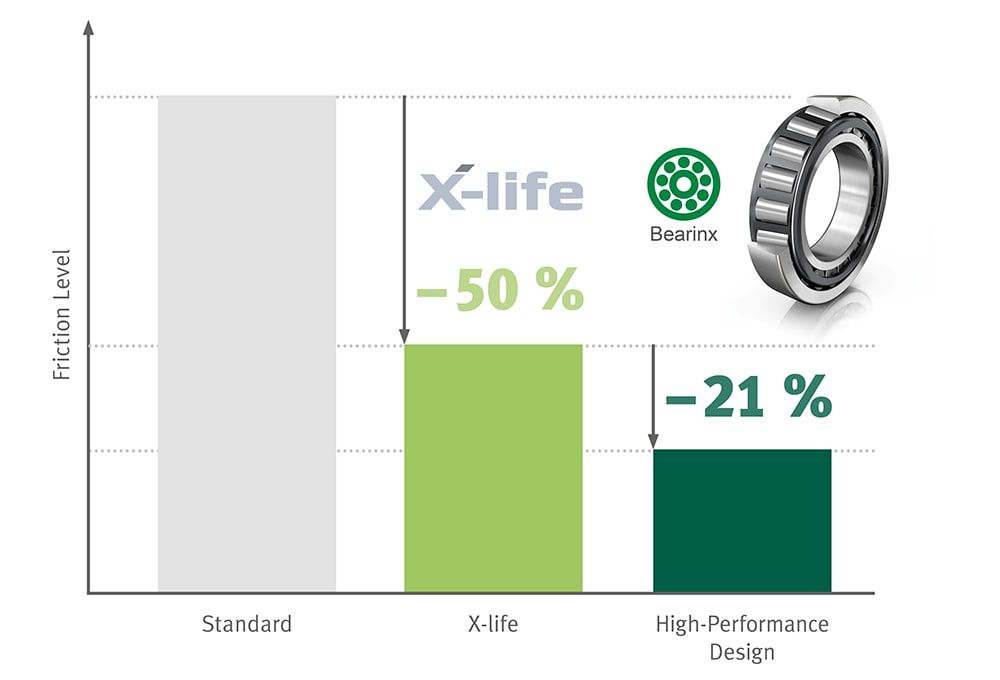 Schaeffler tapered roller bearings in X-life quality are another option for reducing friction without making a design change. Friction can be halved compared to conventional bearings through specially machined raceway and roller surfaces as well as optimized geometry in the contact between the end face of the rolling element and the inner ring rib. Even at low speeds during the startup process, an elastohydrodynamic lubricant film forms due to the improved surfaces and osculations, which reduces the wear and friction under the already very low-viscosity lubrication.