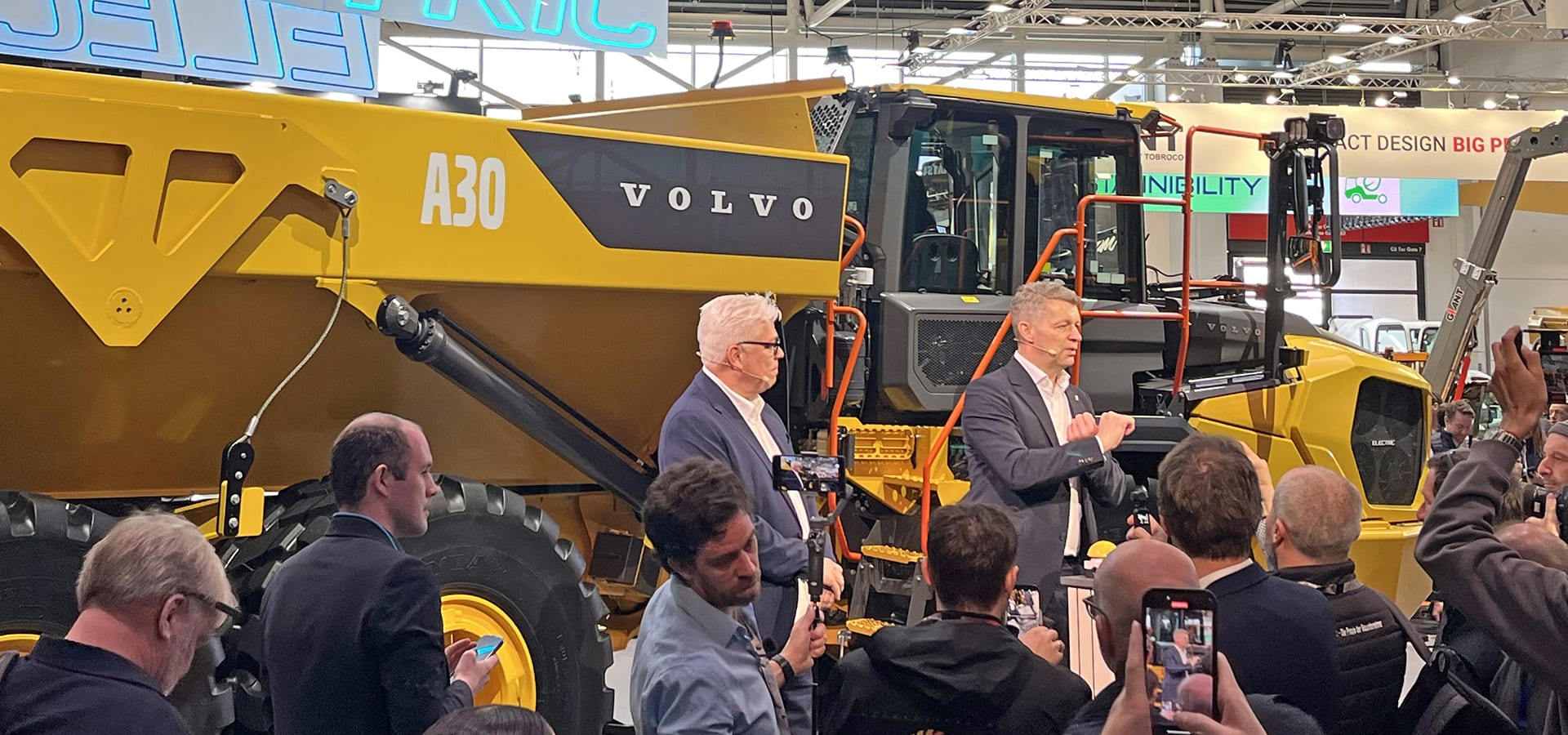Jernberg helped to drop the curtain on a claimed “world first” EV, the A30 electric articulated hauler. Five “cubes” of 600V Li-ion batteries provide 270 kWh of usable energy (450 kWh installed) and a runtime of 4 to 4.5 hours. A 350-kW charger can charge the machine to between 20-80% in one hour. Delivery of A30 and A40 electric haulers will start in Europe in 2026 for selected customers, “then we’ll ramp up for all other markets in 2027 and 2028,” he said.