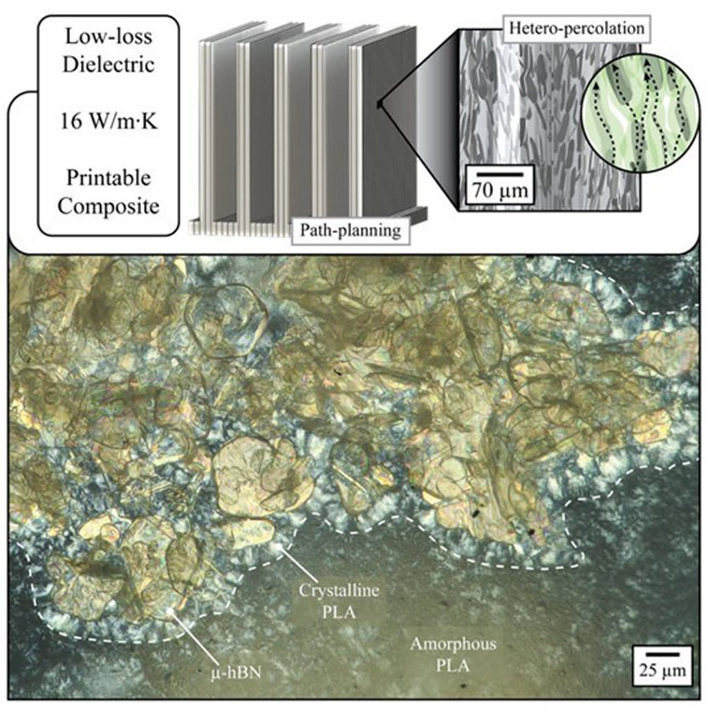 The nanocomposite is first formed into continuous filament, which can then be fed into a desktop 3D printer to create complex structures such as heat sinks, thermal spreaders, mounting plates or panel covers. The 3D printing process further aligns the fillers, boosting the material’s performance. Unlike metal packaging, this hBN nanocomposite is both RF transparent and electrically insulating, so it can be placed in close proximity to high-current and high-voltage electronics without blocking RF signals — critical to communications or radar systems — or risking an electrical short.
