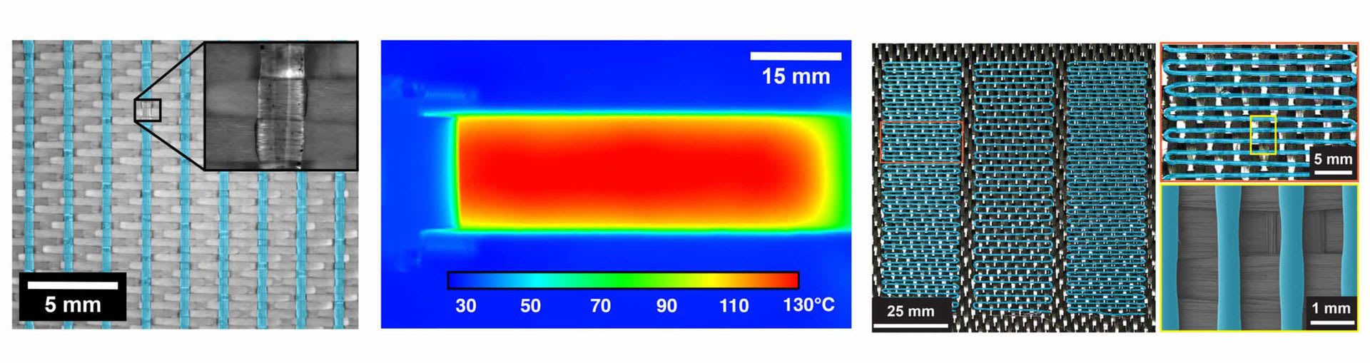 The self-healing material resembles conventional FRP composites, but with two additional features. First, the researchers 3D-print a thermoplastic healing agent onto the fiber reinforcement, creating a polymer-patterned interlayer that makes the laminate two to four times more resistant to delamination. Second, the researchers embed thin, carbon-based heater layers into the material that warm up when an electrical current is applied. The heat melts the healing agent, which then flows into cracks and microfractures and re-bonds delaminated interfaces – restoring structural performance.