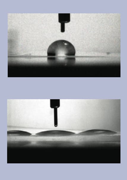 Wettability testing was carried out using one of two methods. For films, a static contact-angle setup using the sessile drop method was used. The setup consists of a micrometer-controlled syringe held in place above a moveable stage. Contact angles were recorded using a goniometer equipped with a charge-coupled-device camera and using an image capture program employing LabVIEW software. Contact angles were measured by defining a circle around the drop, and recording the tangent angle formed at the substrate surface. The LabVIEW program measures this angle on the left and right sides of the snapshot and then averages them for a final contact-angle value.