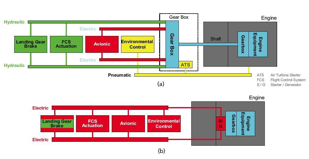 The design of conventional general systems architecture includes the use of a variety of energies. Three main types of energy can be identified: electric, hydraulic, and pneumatic energy, all converted from mechanical energy provided by the engine via gearboxes. Figure 1(a) shows a simplified conventional general systems architecture with three main types of energy. Basically, a redundant electric power supply is used to support the avionic system including flight control computing and mission management. In addition, control and monitoring functions of general systems including different types of sensors are powered electrically as well. The power supply for the primary and secondary flight control actuation, landing gear, and brake is accomplished with a redundant hydraulic system. The environmental control system used for cooling and pressurization of the avionic compartments runs with pneumatic power extracted from the engine. Fur ther more, some system designs include an air turbine starter (ATS) that uses pneumatic power. For ground operation at an airbase, ground power equipment providing all three types of energy is necessary.
