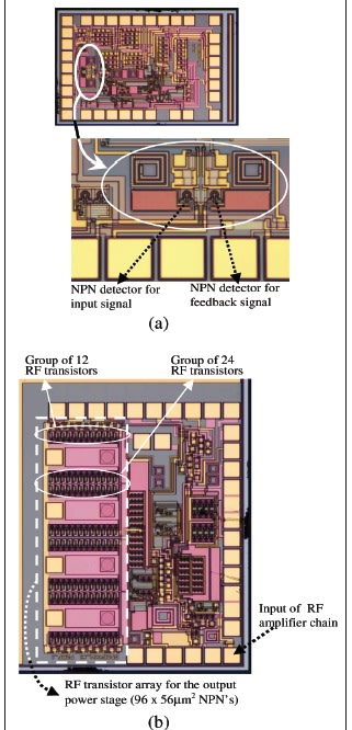The first IC, which includes two NPN transistor-based power detectors, is shown in Figure 1(a), together with an enlarged view of the detector area. Note that in this design, a very conservative approach of placing the two detectors as close as possible for matched performances has been used, with the goal of obtaining as symmetrical EM coupling and heat transfer as possible. The second IC, which includes the RF power transistor array, is shown in (b).