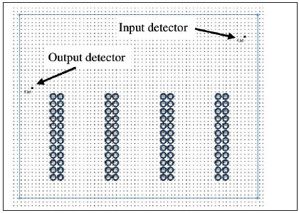Heat transfer simulation was conducted for the estimation of temperature variations across the GaAs chip. For the purpose of this simulation, only the RF transistors in the power stage and the two detectors are included, and the hypothetical scenario with no heat sink is considered. The location of the 96 NPN RF transistors (Figure 1b) is shown in the COMSOL-generated drawing of Figure 2.