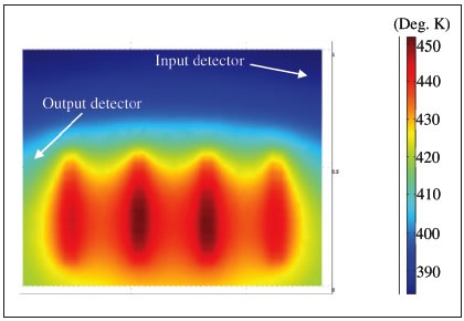 Obviously, as the detailed on-chip structural elements and heat sinking conditions are added to the simulation set-up, the accuracy of the temperature pattern will increase and the heat distribution will correspond more closely to that of a real implementation. Never-the-less, this simplified simulation setup provides valuable temperature gradient information to the designer. Even with this simplified simulation setup, it may be deduced that the temperature difference between the two detectors will reach at least 20º, corresponding to a difference of ~24mV between the two VBE values, which would impair the performances in the two design examples given earlier. Hence, the results suggest that the layout under investigation in this example would not be suitable, and would require different detector locations on the chip.