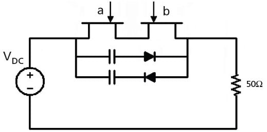 Evaluation of the parts was done in a simple test setup. Two 8A VJFET parts were connected in a back-to-back configuration with common sources. The bidirectional snubber was connected across the parts. An isolated DC power supply was used as a source, and a 50-ohm load was connected in series with the VJFETs. The setup allowed the connections of the VJFET pair to be easily reversed for bidirectional testing. The driver was connected with the gate line to the gates of both VJFETs through individual 5-ohm resistors, and with the source line connected to the common source of both parts.