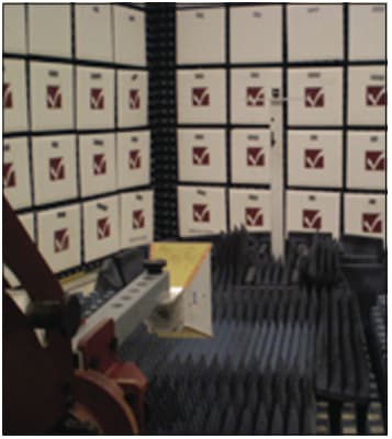 In order to initially validate the antenna design, the reflection coefficient and associated driving point impedance must be matched to the system impedance (generally 50 ohms). Once it has been established that the antenna is matched to the system impedance, the radiation pattern must be measured to compete the final steps of design validation. The measurements are performed in an anechoic chamber by exciting the antenna under test with a known transmit source power and measuring the received power, received voltage, or electric field intensity at a fixed distance. A photograph of an antenna under test in a 3-meter anechoic chamber is presented in Figure 3.