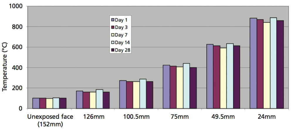 Each data set shows an apparent flattening of the rate of temperature increase at a temperature between 100- 160 °C, holding at this temperature for a period of time, and then an acceleration following this as the temperature starts to increase again. This can be associated with the passage of a boiling front through the material; the concrete initially contains a significant quantity of liquid water in its pores. As this begins to be heated (close to the inside face of the concrete), the water expands upon heating, and fairly soon localized boiling commences. This generates pressure within the pore network of the concrete, forcing the water to flow away from the heated face. This water carries thermal energy as it travels through the sample, causing additional heating of the parts of the sample close to the unexposed face on top of the heat transport due to conduction through the sample.