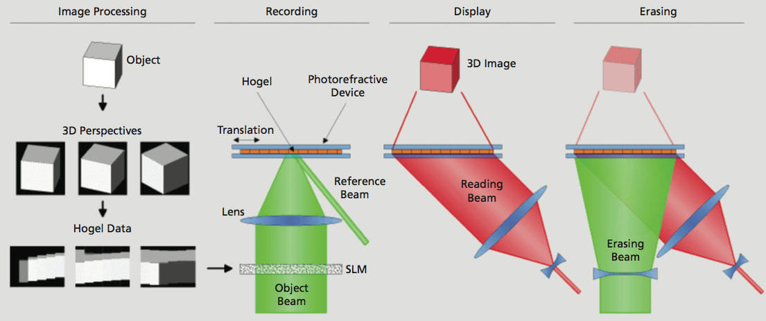 The report details the technical aspects of the holographic 3D display system, including the writing and erasing dynamics of the holograms. The writing process involves using a 532 nm laser beam with specific irradiance and voltage settings to achieve high diffraction efficiency. The researchers found that the maximum diffraction efficiency increases with longer writing times, and they developed a system that allows for new images to be recorded as needed.