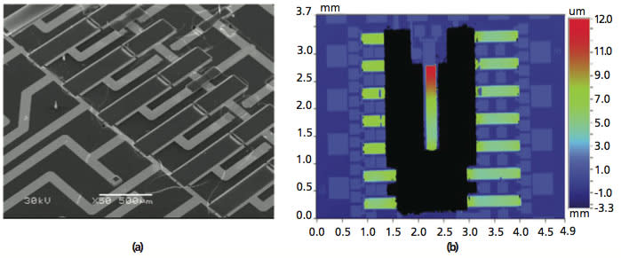 The SOI and DSP wafers were bonded together using Au-Au thermal compression bonding at 360 oC with a force of 800N for 45 minutes. Following the bonding, the handle silicon was etched using deep reactive ion etching (DRIE). To release the cantilevers, the buried oxide on the SOI wafer was etched using reactive ion etch (RIE). The figure shows a scanning electron microscope (SEM) image and an optical profilometer image of the MEMS switch for a DC-DC voltage converter. The smaller cantilevers (<1000 μm) have a slight downward bow that is due to thermal effects and permanent deformation of the metals during bonding, or a thermal and charging effect from the reactive ion etch. The larger cantilevers bow enough to cause contact with the bottom electrode. The optical profilometer data suggest that the smaller cantilevers have an acceptable gap of 2-3 μm between the cantilever and the bottom electrode. Using these data, a Rev B full wafer fabrication process was developed.