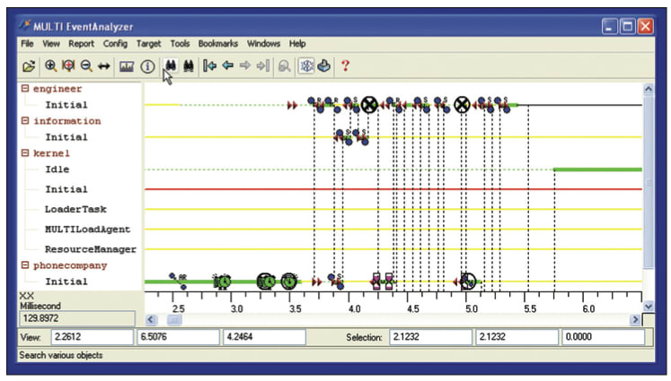 To make sense of the log data, you also need a graphical tool that will display it in a linear time display. This should let you easily zoom into areas of interest, correlate specific events with the threads that generated them, and tell you where they came from in the code. You need this when developing a multicore system, because there will inevitably be problems that show up very infrequently, perhaps only once in weeks of testing. With logging, there is a good chance that it will be possible to figure out what happened and fix it. The simplest way to do this is to compare a log of the failure with a log of a successful run. Differences in the logs are good indications for where to narrow the search.