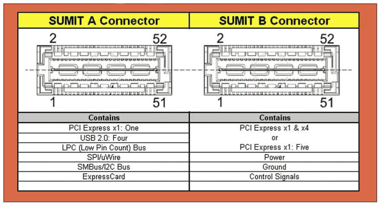 expansion approach that is independent of any particular board form factor. SUMIT defines two 52-pin, high-density, high-speed connectors and their signal assignments. The standard configuration includes both the SUMIT A and B connector, but the B connection is optional, depending on the configuration and signals used by the SBC or I/O board.