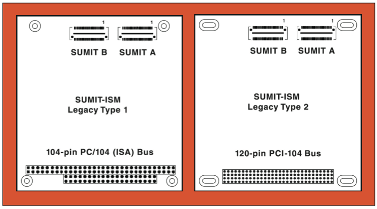 The SUMIT-ISM specification includes two legacy stack types for modules with PC/104 and PC-104 connectors. It uses slotted mounting holes on ISM modules to provide symmetry not found with PC/104. These options allow the continued use of their connectors in the existing locations along with the established physical dimensions and mounting holes, as well as the new high-speed serial signals through the SUMIT connectors.
