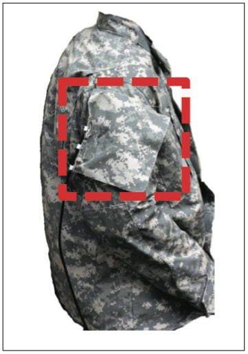 The design focuses on an easily removable patch design. This enables the user to easily attach and detach the antenna from their radios while at the same time avoiding the problems associated with repeated cycles of washing. It also provides a low-profile, lightweight, highly flexible design that can easily conform to any active surface. The base design consists of three layers: a top camouflage layer made of any type of flexible fabric, an intermediate feed/ radiator layer, and a bottom isolation/ attachment layer. The feed/radiator layer is uniplanar and can consist of a meander line monopole or a wideband radiator such as a bow-tie slot radiator that can be optimized for the particular application under consideration. The bottom layer isolates the middle layer from the body and contains attachments such as a hook-and-loop mechanism that can be used to attach the antenna to a uniform (see figure).